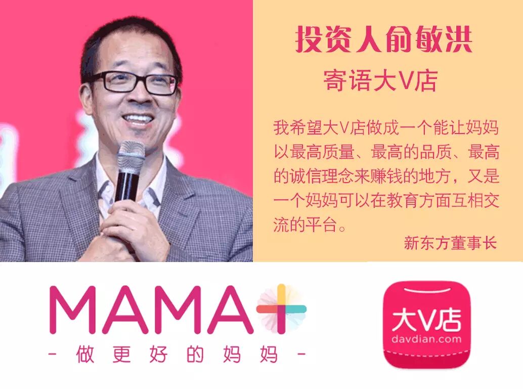 过去一年的时间,超过30万的妈妈在大V店买到了来自全国各地妈妈为她们推荐的、最适合她们孩子的优质正品,大V店主要经营【童书绘本、婴童产品及妈妈产品】,上线至今,全平台销售额近3亿元,妈妈卖家赚取的收入超过3200万元。目前,平台注册用户超过100万,日活跃用户超过50万,平台月交易额突破5000万,订单全部来自移动端,预计今年全年销售额将超过15亿元。