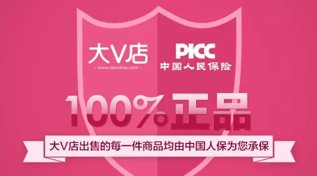 2016年1月1日,大V店与中国人民财产保险股份有限公司(PICC)正式签订了大V店“正品保证险”协议,承诺大V店售卖的每一件产品100%为正品,并由中国人民财产保险股份有限公司(PICC)为消费者购买的每一件产品承保,如果消费者在大V店平台购买到假冒商品,将无条件获得退货退款支持。