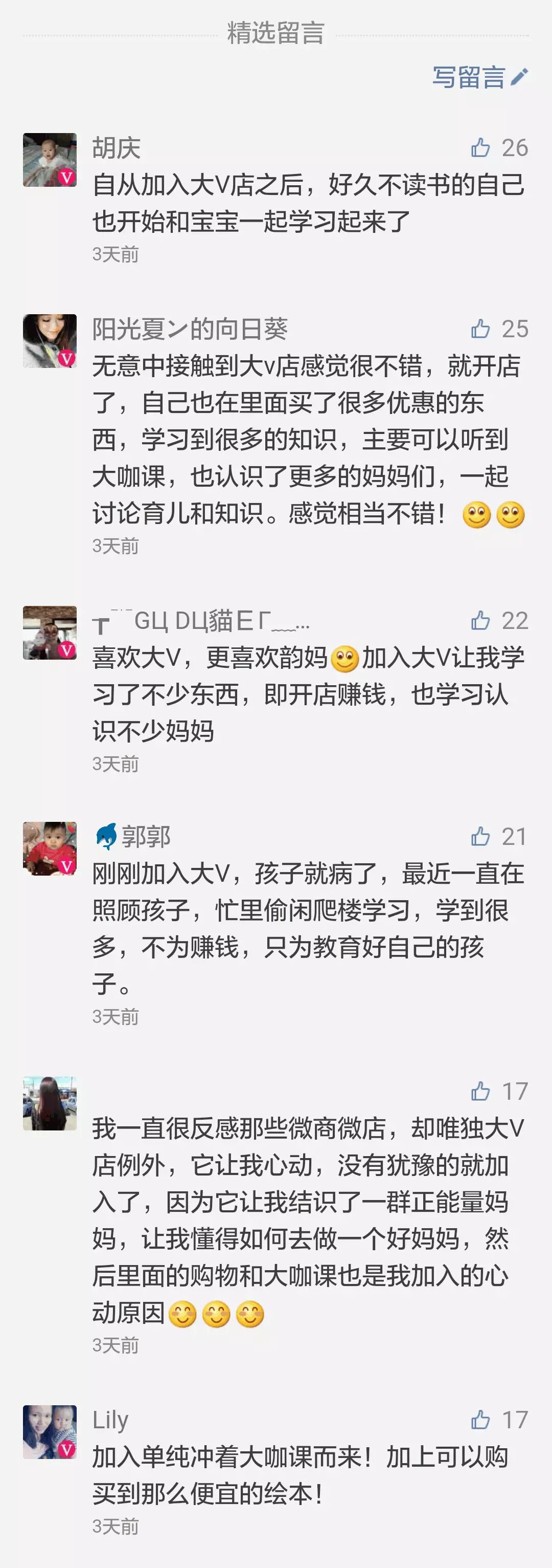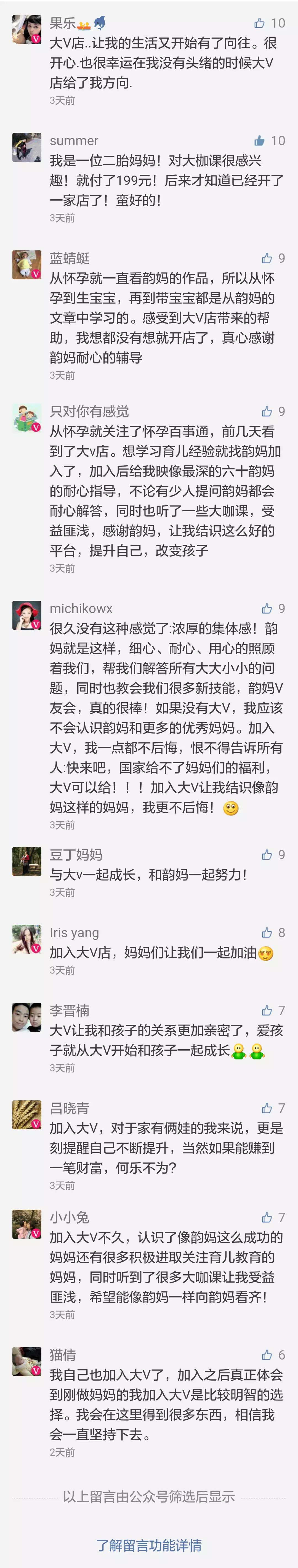 很多人说:韵妈,你做公众号那么成功,为什么还要加入大V店? 因为我喜欢亲子阅读,并且我的公众号的粉丝90%都是妈妈,我自己也是一位妈妈,知道妈妈们需要什么,我介绍大V店给大家,我认为大V店给妈妈除了佣金外,更重要的是让我们得到提升,能够跟着大咖们学到育儿家庭方面的知识,同时结交到很多志趣相投的妈妈。一起讨论育儿,家庭,工作,真的非常惬意。如果没有大V店,全职妈妈是很难有机会认识其他优秀妈妈的。