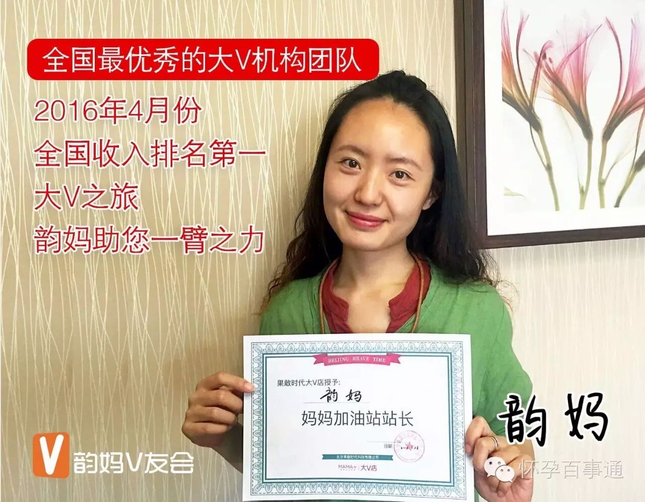 韵妈是2016年3月28日成为大V店机构站长以后,开始正式推广大V的,韵妈大V团队目前已经超过4000人,连续2个月收入排名全国排名第一。在这2个月时间,韵妈成了大V的明星,全国上百万v友知道了我,我几个私人微信都快满员,为了更好的服务韵妈大v团队的妈妈,我还请了4个小伙伴,并且还受邀去妈妈大咖课堂做直播,为v友分享我和大V的故事以及大V推广经验。