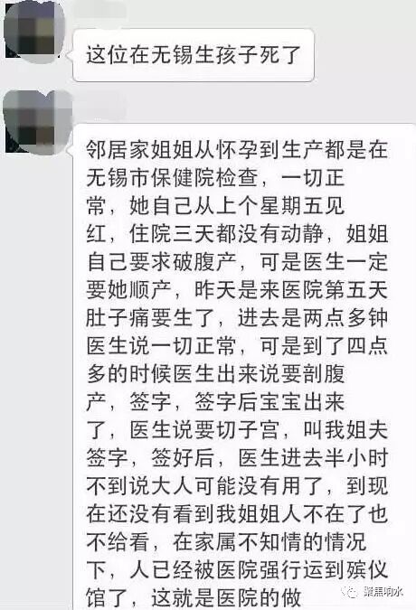 响水零距离网3月10日,9日晚间接到网友爆料:“邻居家姐姐从怀孕到生产都是在无锡市保健院检查,一切正常,她自己从上个星期五见红,住院三天都没有动静,姐姐自己要求破腹产,可是医生一定要她顺产,昨天(3月6日)是来医院第五天肚子痛要生了,进去是两点多钟医生说一切正常,可是到了四点多的时候医生出来说要剖腹产,签字,签字后宝宝出来了,医生说要切子宫,叫我姐夫签字,签好后,医生进去半小时不到说大人可能没有用了,到现在还没有看到我姐姐人不在了也不给看,在家属不知情的情况下,人已经被医院强行运到殡仪馆了,这就是医院的做法。”