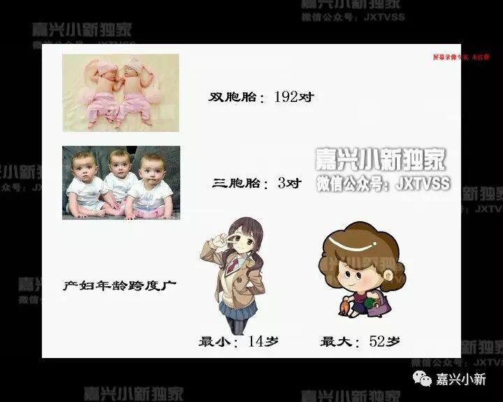 今年出生的新生儿中,最重的5000克,达到了10斤,最轻的只有760克,2斤都不到。在妈妈肚子里呆的时间最长的,竟然长达42周,也就是十个半月,而最迫不及待出来看世界的只呆了26周加6天,六个多月就出世了。今年的新生儿里,双胞胎192对,三胞胎3对。产妇的年龄范围跨度较大,最小的只有14岁,最大的已经52岁,不少二孩妈妈都是隔了好多年再来生育的高龄产妇。