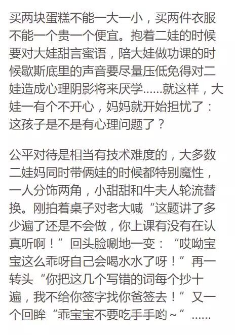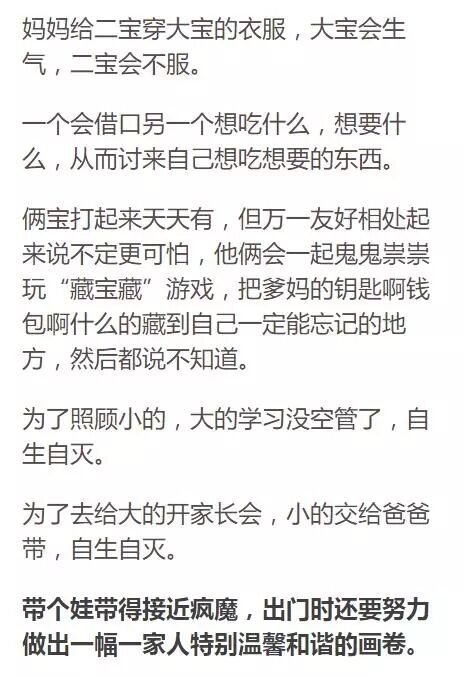 家里一有啥鸡飞狗跳,就赖在主张生二娃的那个人头上。比如大宝生病了全家忙不过来的时候,大宝要送补习班全家人兵荒马乱的时候,大宝把二宝传染了跑一趟医院得三个以上大人跟着得时候,俩孩子打起来一轻伤一重伤的时候……恨不得把二娃塞回肚子去,怀念当时的大娃还是那么得天真无邪可爱纯真,当时的全家人还是那么得从容淡定有条不紊其乐融融……