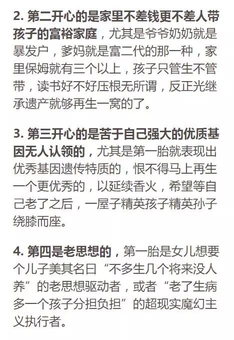 看来喜欢生孩子这件事还是遗传基因驱使的,父母不是独生子女的,往往更喜欢再多生一个。不过好多80后思前想后仔细一琢磨觉得还是不行,造孩子就三分钟的事,养孩子可是扒皮抽筋的事,一个孩子一不留神就把全家从中产砸到贫困人群里了,还把老大也给连累了。