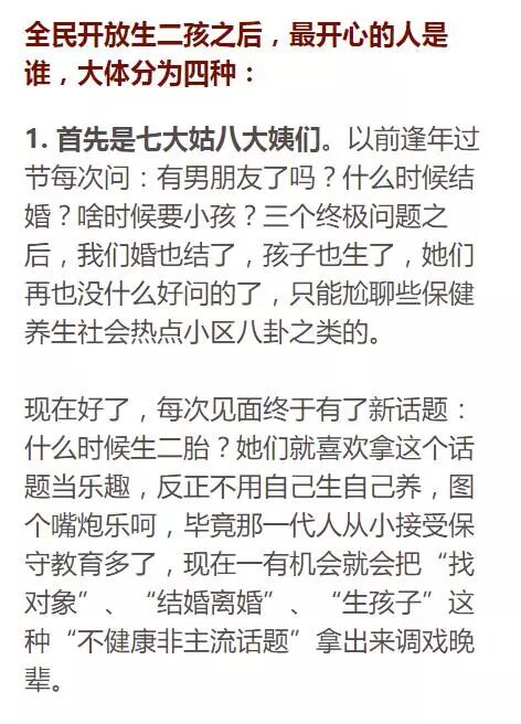 第三境界就是我们这一辈了,赶上好时候,国家开放二孩了。其实双独一直以来都允许生二娃,2013年又开放了单独二娃指标,只是这一届70、80后普遍觉悟不够,积极响应的并不多。自从2017年全面开放二孩政策之后,轰得一下!突然间,中年妇女们肚子都挺起来了。