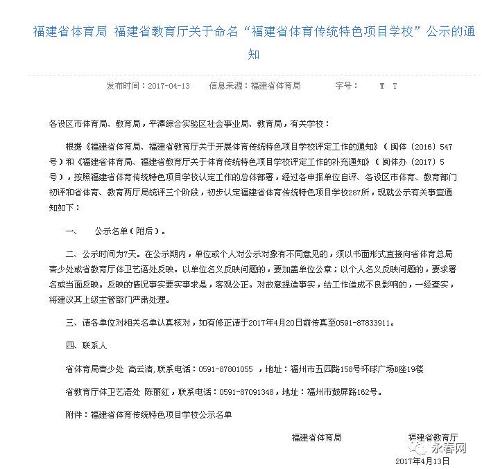 近日,“福建省体育传统特色项目学校”公示名单发布,共287所学校入选,其中永春有两所学校入选!
