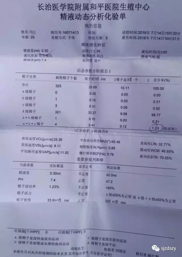 马先生,30岁,山西省长治市,结婚2年妻子迟迟未孕,2016年7月14日在长治医学院附属医院检查,精液量0.3毫升,液化时间60分钟,A0%;B0.31%;C0.92%;D98.77%;精子浓度33.6百万/ml,几乎没有成活的精子,这样的情况,基本上西医都会建议试管。