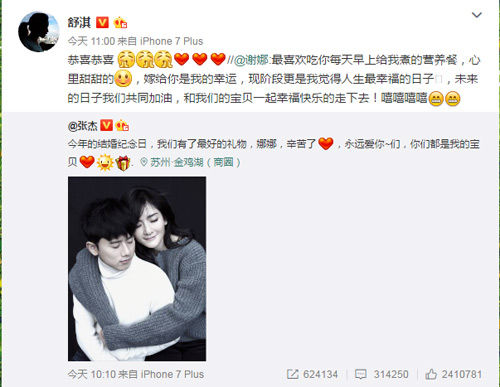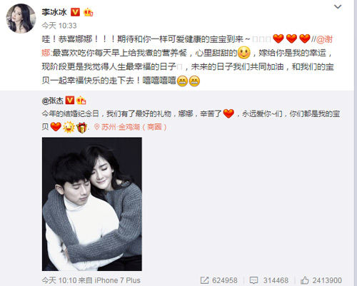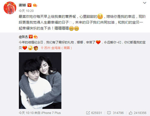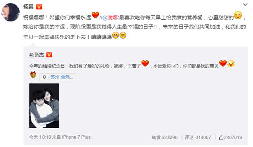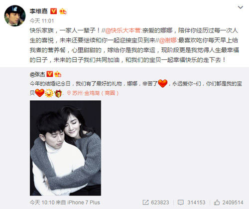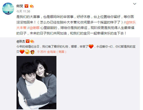 九月的娱乐圈真是好事连连,这边范冰冰牵手大黑牛,那边张杰就趁着结婚纪念日宣布妻子谢娜怀孕的喜讯:“今年的结婚纪念日,我们有了最好的礼物,娜娜,辛苦了,永远爱你们,你们都是我的宝贝。”