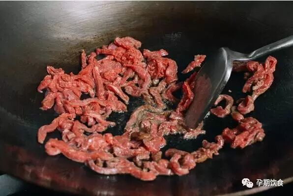 2.炒菜锅中放两勺油,等到油热时放入腌制好的牛肉,进行翻炒,看到牛肉变色时将其盛出待用