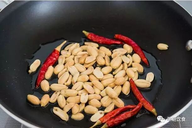2.锅中放两勺油,油热时,放入干辣椒和花生,炒香,盛出待用。
