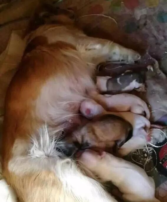 但是狗崽子算是平安的降生了,我却有点无法接受了,谁能告诉我,一只金黄色的金毛,怎么就生出来这样的狗狗了?这貌似是土狗吧?这是个什么鬼?