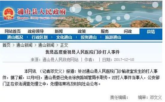 9日早上,通山县人民政府网站发布了《涉通山县人民医院“嚣张女子医院脚踢怀孕护士”网络舆情的处置声明》一文通报此事,但随后文件名改为《我县高度重视县人民医院门诊打人事件》。据了解,12月9日,通山县委已免去徐良路城管局长职务。对打人事件当事人,公安部门正在依法调查处理之中,处理结果将及时向社会公布。