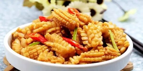 锅中烧水,水开后,倒入少许盐、料酒去腥,然后将改刀好的鱿鱼条迅速放入锅中焯烫,然后迅速捞出,时间不要超过20秒,这样漂亮的鱿鱼花就成形了,焯烫好的鱿鱼花放入水中冲洗干净备用。