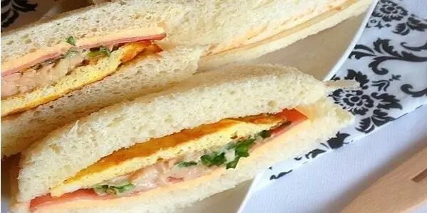 食材:吐司6片,金枪鱼罐头90g,烟熏火腿3片,鸡蛋2个,苦菊若干,三明治芝士片3片。