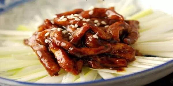 锅中留少许底油,放入甜面酱、1勺生抽、白糖和少量的高汤或者清水,调匀酱汁后,放入滑过油的肉丝翻炒均匀后成出码放在葱丝上面。