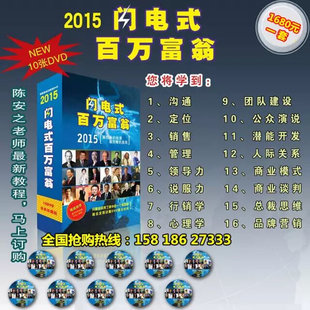 #1:立刻拨打158-186-27333 刘老师,跟他申请订购《2015闪电式百万富翁DVD》这套产品。