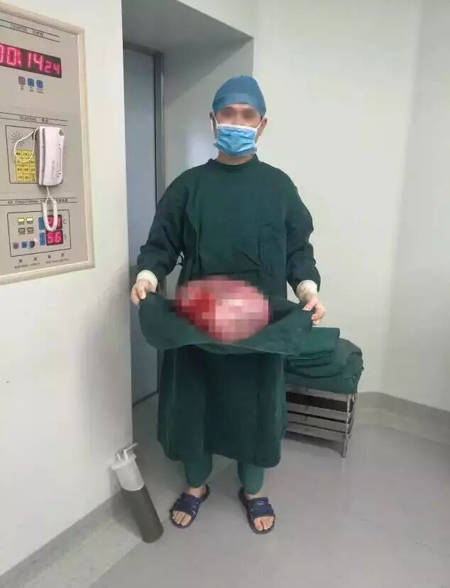 经过近2个小时的手术,缓缓放出囊肿内1万毫升黄绿色粘稠液体,成功从王女士腹部切除一颗重达20余斤重的囊性肿块,整个囊肿有一个脸盆那么大。