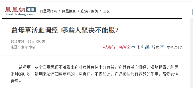 同时,也在《凤凰网》健康栏目看到一篇文章《益母草活血调经 哪些人坚决不能服?》