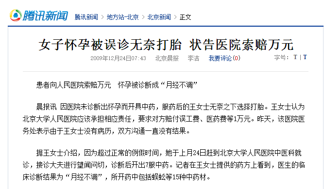 2009年,《腾讯新闻》报道,王女士因为超过正常的例假时间,她于11月24日赶到北京大学人民医院中医科就诊,接诊大夫进行望闻问切,诊断后开出7服中药。记者在王女士提供的药方上看到,医生的临床诊断结果为“月经不调”,所开药中包括蜈蚣等15种中药材。