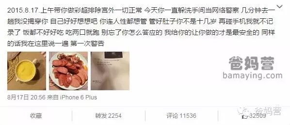 上午带你做彩超排除宫外一切正常,今天你一直躲洗手间当网络警察,几分钟去一趟我没揭穿你。自己好好想想吧,你连人性都想管,管好肚子。你不是十几岁,再碰手机我就不记录了,饭都不好好吃,吃两口就跑。别忘了你怎么答应的,我给你的让你做的才是最安全的,同样的话我在这里说一遍,第一次警告。