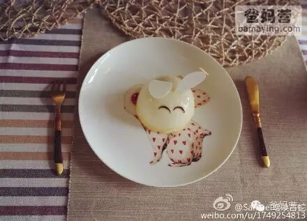 看看老公给老婆做的布丁,因为老婆微博叫@吃老虎的兔纸,布丁还特意做成兔子的样子,放在兔子盘子上。