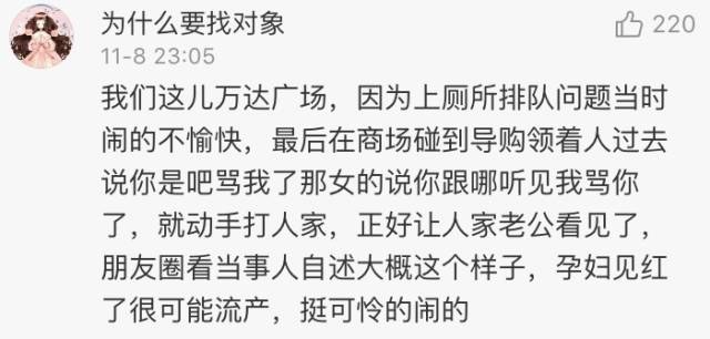 据调查,事情的起因是这位孕妇在商场排队上厕所,女导购插队,两个人起了些言语争执。