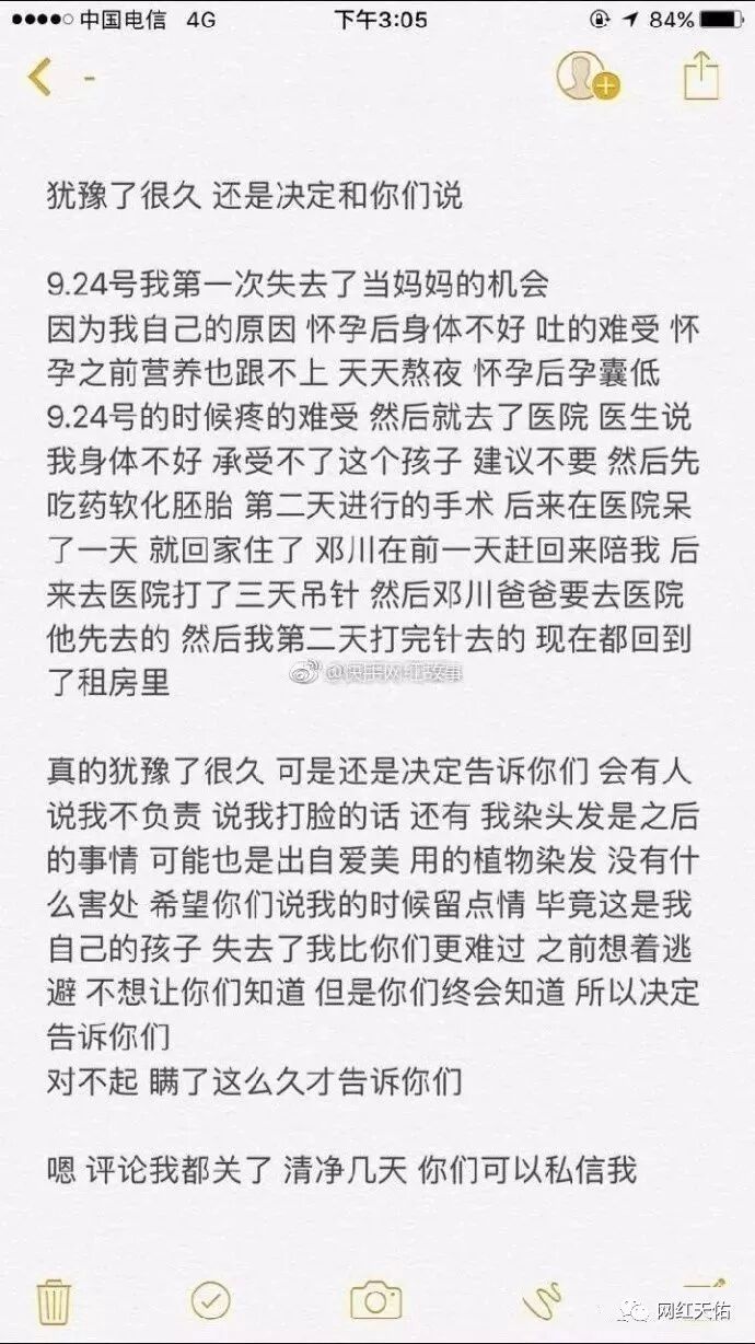 快手网红周周和快手另一位网红邓川相恋,前段时间周周宣布自己确实怀孕了,而周周刚刚17岁,还没有成年,但是还是选择当妈妈。但是周周近日发文因身体原因,医生不建议自己要这个孩子,已经在9月24流产。