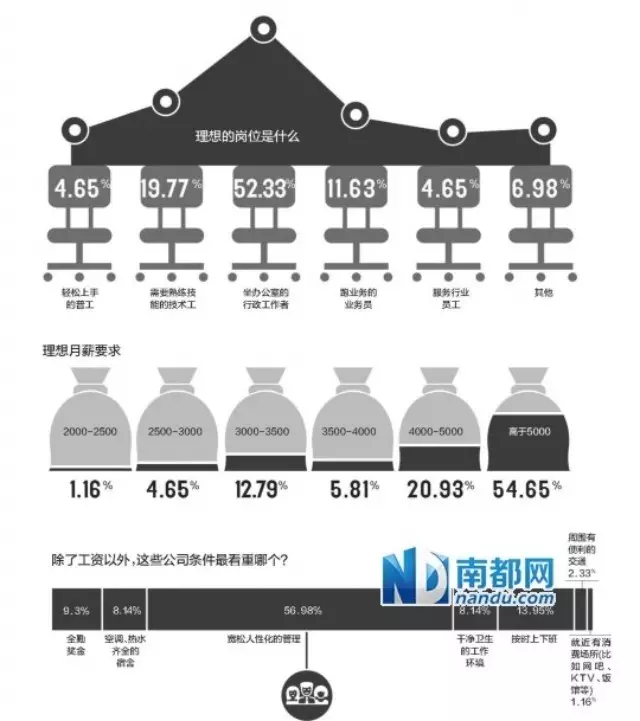 超过一半的受访者要求自己的月薪高于5000元,在佛山,这个工资水平已经超过了一部分公职人员的工资。调查显示,新一代外来工对收入要求越来越高,最主要的两个理由是,想要追上“城市人”的水平,也想对得住自己的受教育程度。