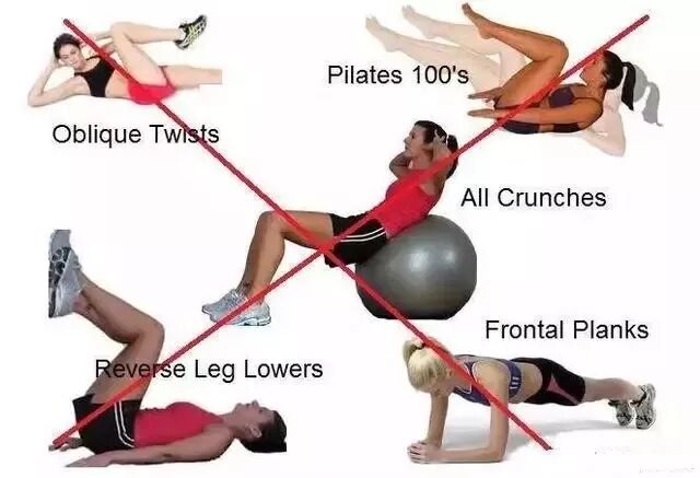 当腹直肌分离距离在2~3指时,切记不要进行躯干弯曲和扭转的练习,包括仰卧起坐、卷腹、平板支撑等。这些运动会同时增强腰部、背部肌肉的力量,会把腹部的薄弱进一步往两边拉,让腹直肌分离得更远。