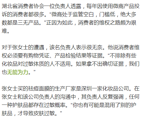 然而,当闺蜜将情况反映给上级代理,对方否认产品有问题拒绝赔偿,并称除非张女士能拿出直接证据,证明她脸上的红肿和血液中的铅含量超标和面膜有直接关系。