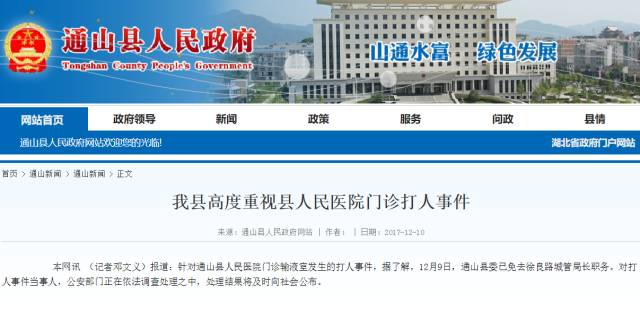 针对通山县人民医院门诊输液室发生的打人事件,据了解,12月9日,通山县委已免去徐良路城管局长职务。对打人事件当事人,公安部门正在依法调查处理之中,处理结果将及时向社会公布。