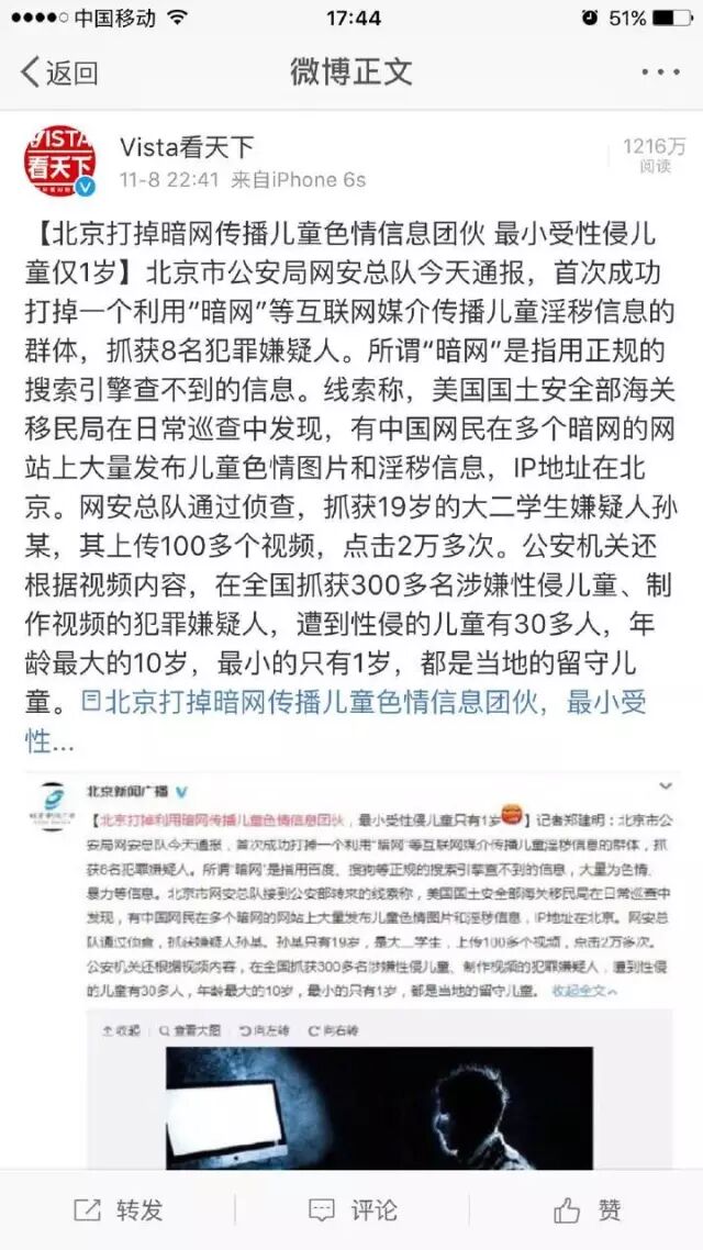 前几日,北京打掉暗网传播儿童色情信息团伙,最小受性侵儿童仅1岁。