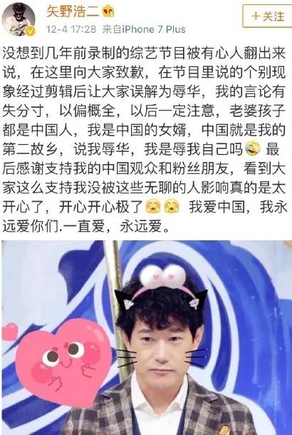 虽然得到网友的支持,不过矢野浩二身份敏感,还是很担心被误解,很快在微博解释了剪辑问题,并且对自己以偏概全的言论道歉。