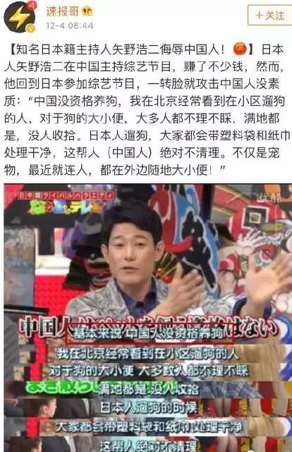 最近有一些营销号在发矢野浩二在日本接受采访的视频,他谈到中国人养狗的一些不好的习惯,这些言论被营销号引导成“侮辱中国人”