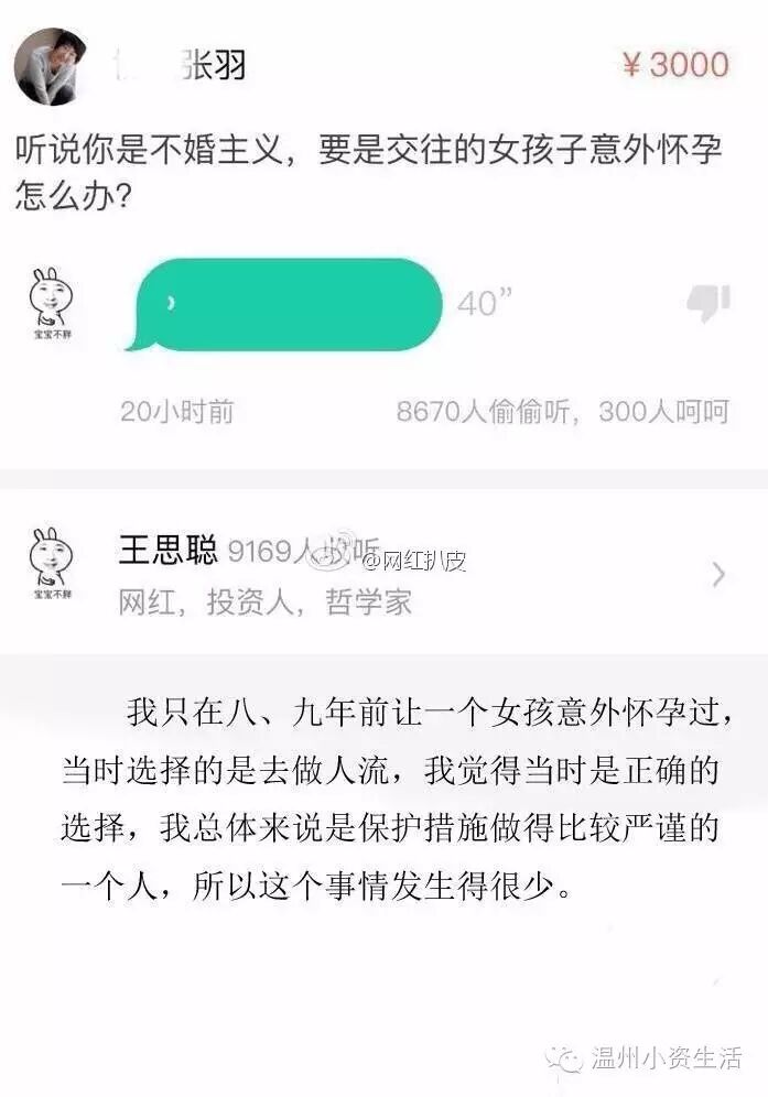 王思聪回答:张大夫我觉得你前半句可以直接删除了,我交往的女孩子意外怀孕和我是不是不婚主义好像没有什么太大的关系吧。