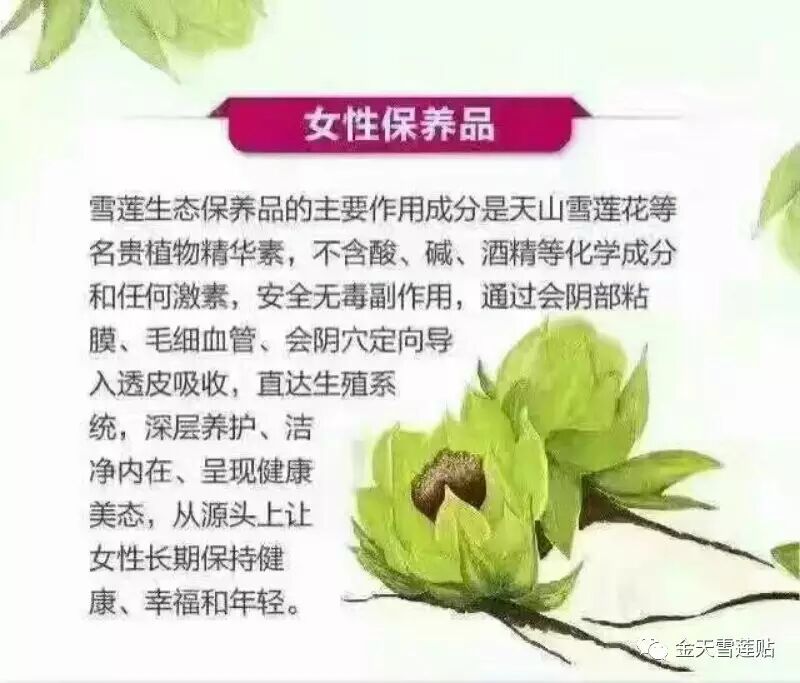 【雪莲贴这么神奇?】雪莲帖为什么如此神奇?是因为当年新疆雪莲研究所(基于发现新疆女人都不坐月子,切妇科发病率只有6%,这个主要源于新疆人把天山雪莲花摘下来做马鞍上的坐垫,他们长期坐在上面,因此很少有妇科疾病,但是他们对雪莲是连根拨起的,雪莲6年才开花,所以建立了新疆雪莲生物研究所,致力于雪莲资源的保护和应用)。其中60%的雪莲供应制作雪莲生态保养,另外40%分别供应给中国中医制药厂和新疆制药厂,这般神奇的独一无二造就了人类生态保养的软黄金!