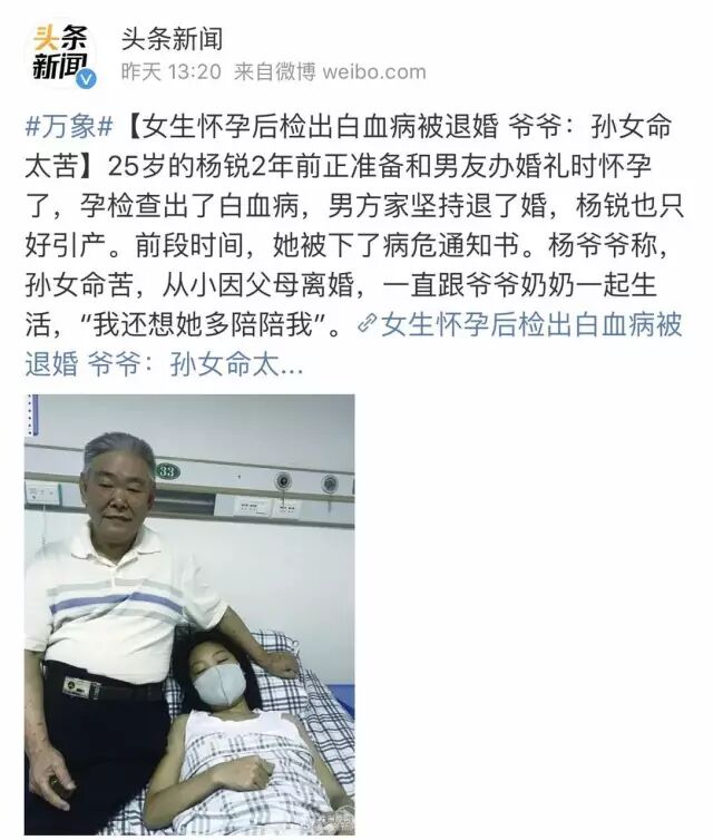 看见昨天的一条热搜,叫:女生怀孕后检出白血病被退婚。