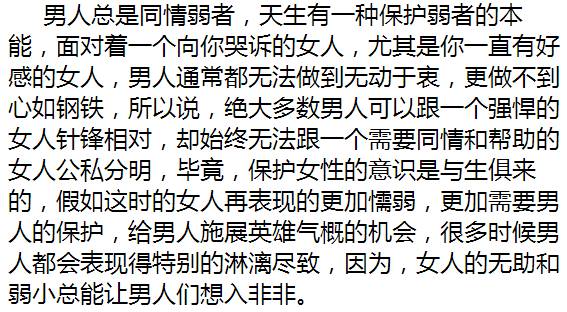 男人爱江山更爱美女,因而男人爱美女绝对不是错。男人不喜欢那种需要仰视的女人,通常喜欢比较容易相处更容易接近更容易得到的女人,这就是男人的“贱”性。把男人当成追逐目标的女人一般都会把男人当成偶像或崇拜对象,这可以大大提升男人的英雄情结,这也是男人为什么不喜欢有思想有个性女人的根本原因。所以说,能够诱惑男人的女人,通常都是处处尊重男人,时时表现出足够的亲和力,这样的女人往往会让男人不知不觉爱上你。
