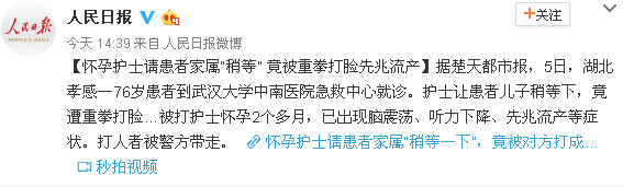 据了解,被打护士今年34岁,已怀孕两个多月,经检查,她牙龈撕裂,听力下降,急性颅脑损伤,先兆流产。这么护士平时工作认真,尽职尽责,在护理的岗位上工作了13年,被评为“2015年度武汉大学中南医院优秀护士”。而她的这个孩子也来之不易,此前曾经历过痛苦的流产。
