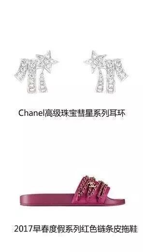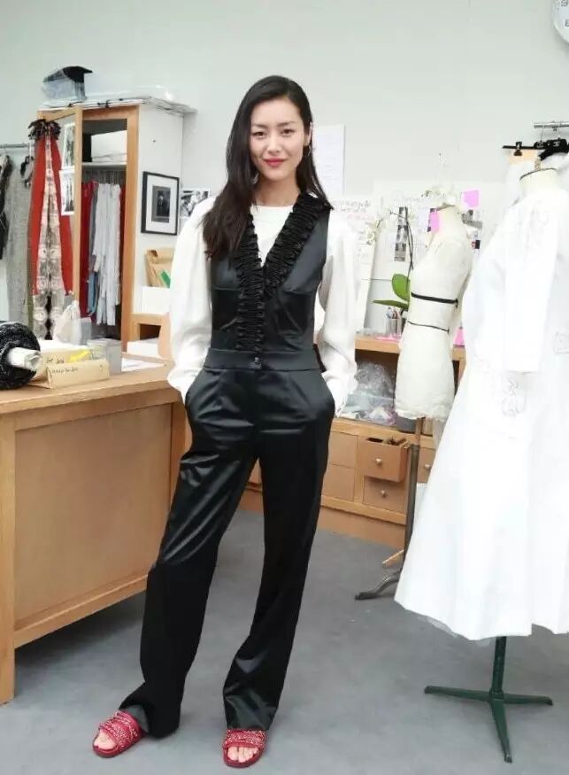 超模刘雯身着香奈儿2016秋冬高级成衣预告系列黑色连身裤装,搭配早春度假系列红色链条皮拖鞋,耳环也是Chanel高级珠宝彗星系列。