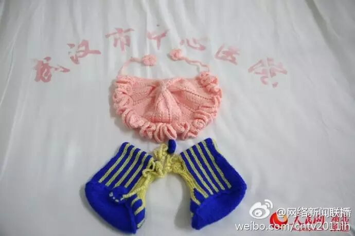 了解到母亲的心思后,匡奶奶的女儿曹女士决定用毛线亲手织个礼物送给刘思利。由于白天需要上班,曹女士连续一周织到深夜。昨天上午,刘思利一脸微笑地走进病房时,匡奶奶突然掏出一个塑料袋,说是送给她的。刘思利打开一看,里面是个粉色的帽子和黄蓝相间的袜子,手工很精致,小小的特别可爱。当得知这是匡奶奶的女儿熬夜亲手织的时,刘思利觉得特别温暖和感动。