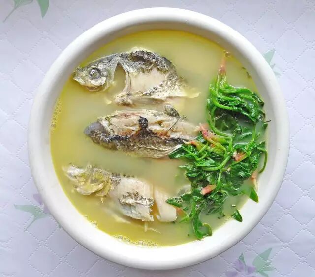 做法:(1)鲫鱼加盐、料酒腌制;菠菜择洗干净,焯水后切段。(2)葱段、姜片入油锅炝香,放入鱼片略煎,加水煮沸,小火焖10分钟,投入菠菜段和盐即可。