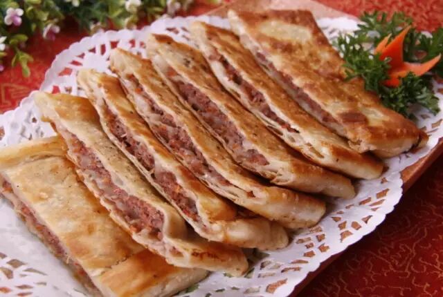 做法:(1)牛肉末加葱花、姜末、盐、料酒、香油,打入鸡蛋,搅拌均匀。(2)面粉加水和成面团,擀成饼,放上一层牛肉馅,放平底锅煎熟,卷起切小段即可。