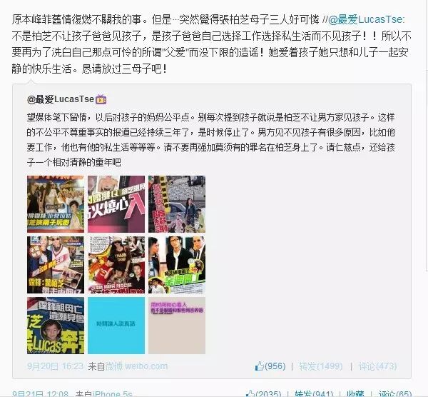 近日,一位署名“最爱LucasTse”的网民在微博发文,直斥谢霆锋对两位儿子不够关心,扬言不是柏芝不让霆锋见孩子,而是霆锋选择工作和私生活而不见孩子,希望传媒对柏芝公平一点。柏芝前经纪人中国星老板向华强太太陈岚转发微博并说:“原本锋菲旧情复燃不关我的事。但是……突然觉得张柏芝母子三人好可怜!”