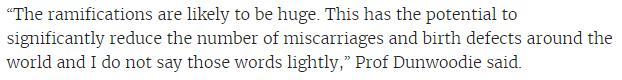 “这项发现的派生影响特别深远,有可能大幅减少全世界各地的流产率和先天缺陷率,我可不是随随便便说这些话的。”Sally Dunwoodie说道。