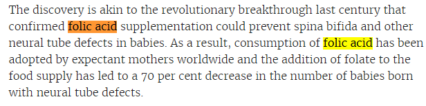 这项发现的重要性,堪比上个世纪叶酸(folic acid,维生素B9)被发现能预防宝宝脊柱裂和神经管缺损的问题。