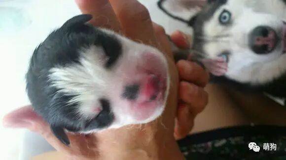弱弱的连眼睛都没有睁开,鼻梁上还有一块黑色的小胎记,主人小心翼翼的捧在手心里。看见狗妈妈紧张的目光,主人也很快将小狗还给了狗妈妈,小狗很快就钻到狗妈妈肚皮下学着喝奶。