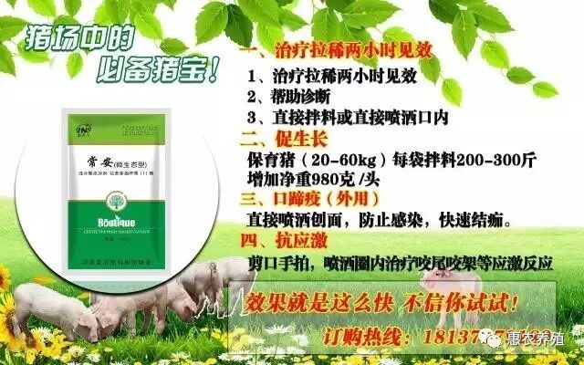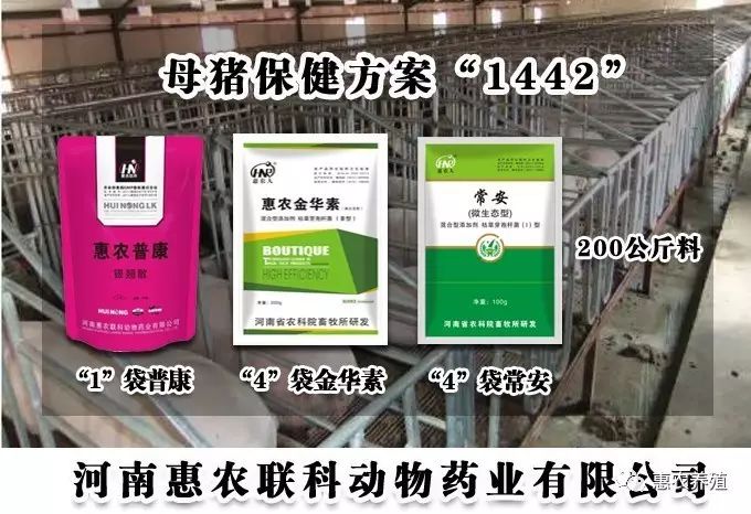 哺乳母猪料200公斤加入惠农普康一袋、惠农金华素4袋,产后3天加常安400g。