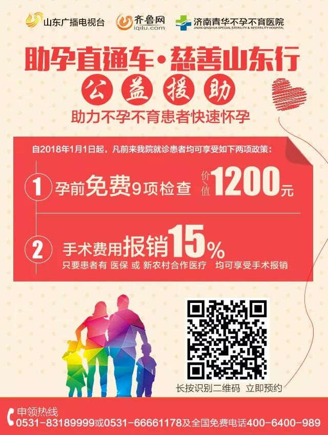 患者想了解详情,可通过手机登陆官网m.120qh.com 网上预约,或直接拨打电话:0531-66661178或全国免费热线:400-6400-989 报名,领取不孕症免费孕前检查券。