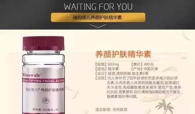 瑞倪维儿养颜精华素为人体补充了因年龄增长而逐渐减少的必须元素,从而改善人体透明质酸含量低,胶原蛋白失水变性,免疫酶数量逐渐减少,皱纹产生,身体内炎症、毒素郁积,自行清除自由基的能力下降及脂褐素堆积等问题。